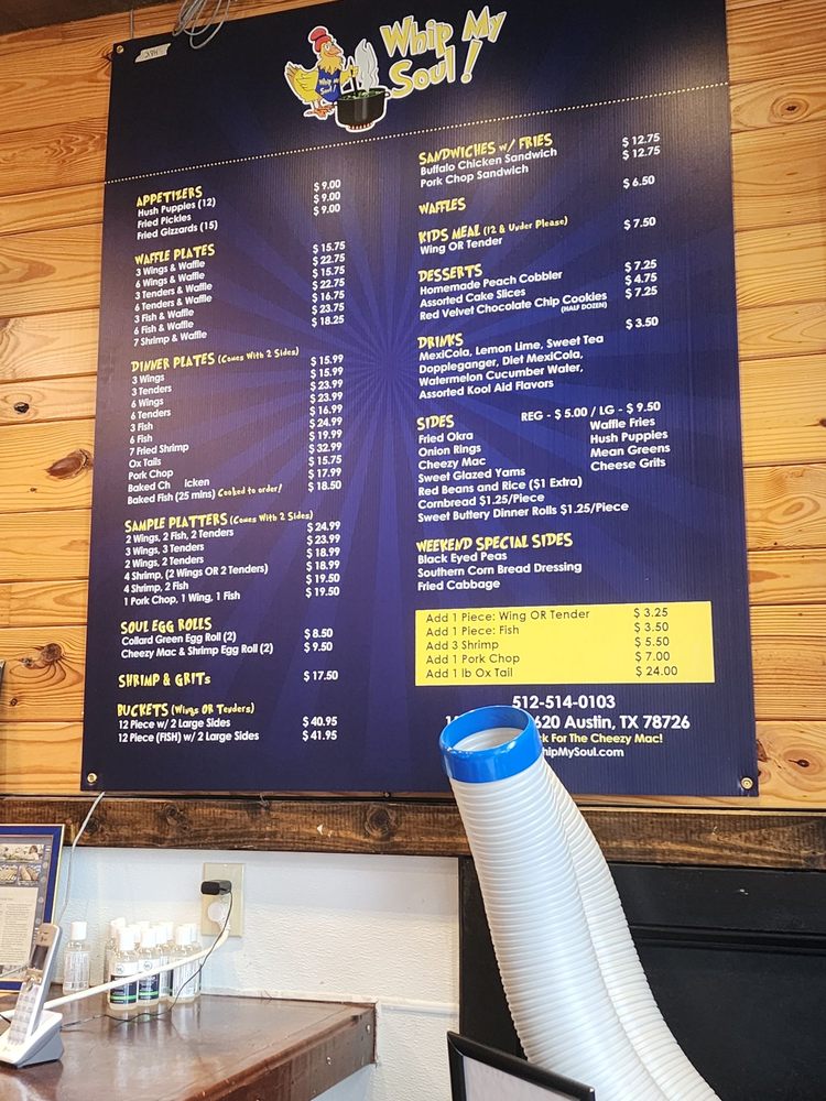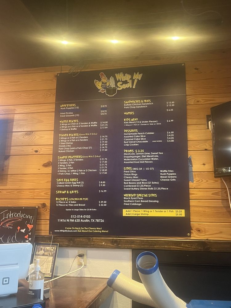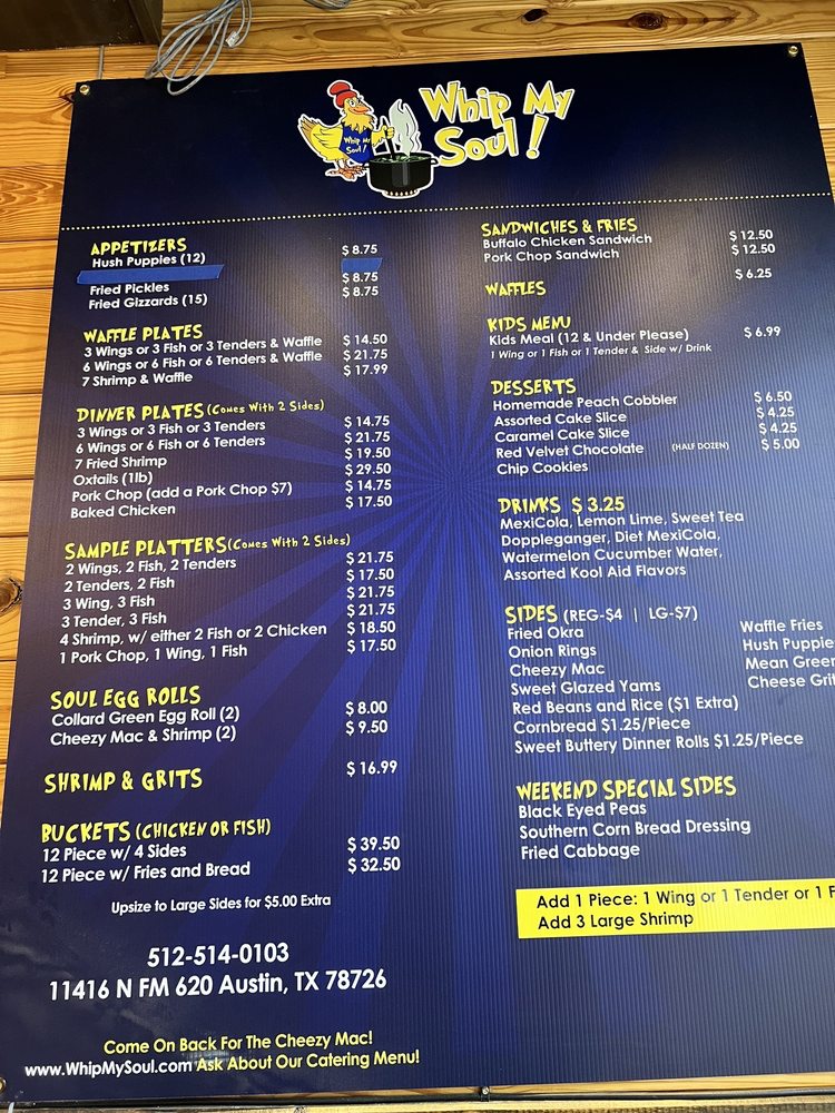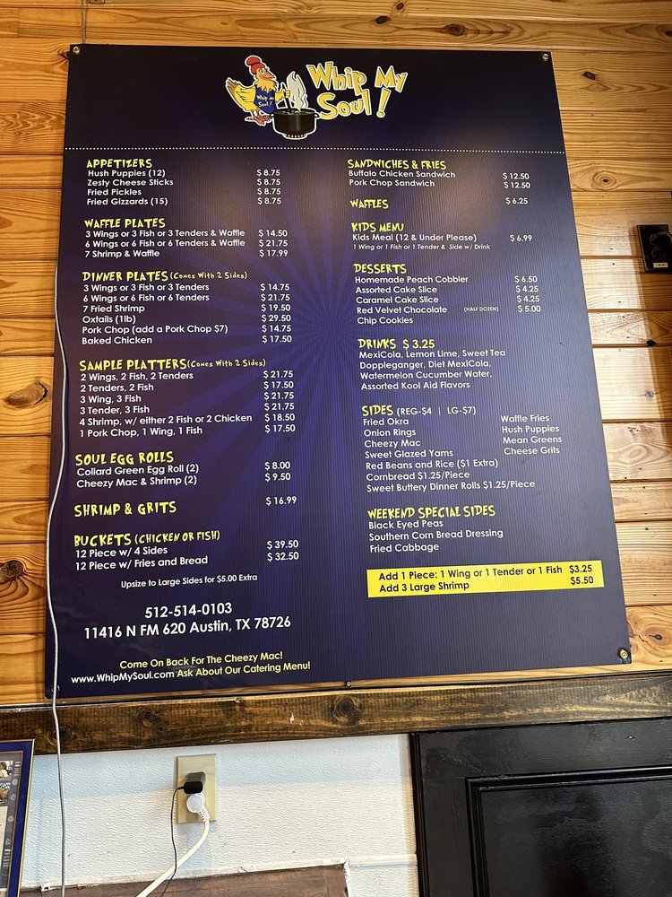 Introducing Whip My Soul, a soulful Southern chicken shop located in Austin, Texas. This divey yet inviting establishment offers a range of delicious dishes perfect for lunch, dinner, or dessert. From large, perfectly seasoned chicken wings to flavorful mac and cheese and glazed yams, each dish is a soulful delight. The collard green egg rolls and oxtail platters are unique and delightful surprises. The cornbread is light and tasty, and the sweet tea and grape koolaid are nostalgic favorites. The ambiance is chill, with friendly staff and a welcoming atmosphere. With a diverse menu, attentive service, and authentic flavors, Whip My Soul is a must-visit for lovers of soul food.