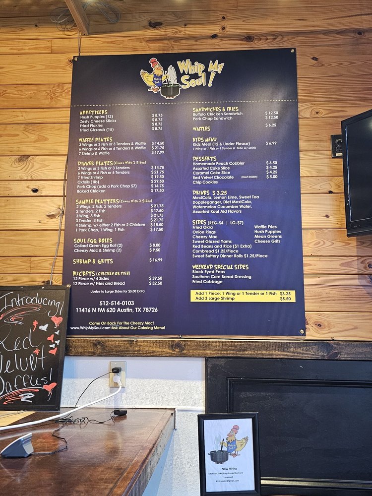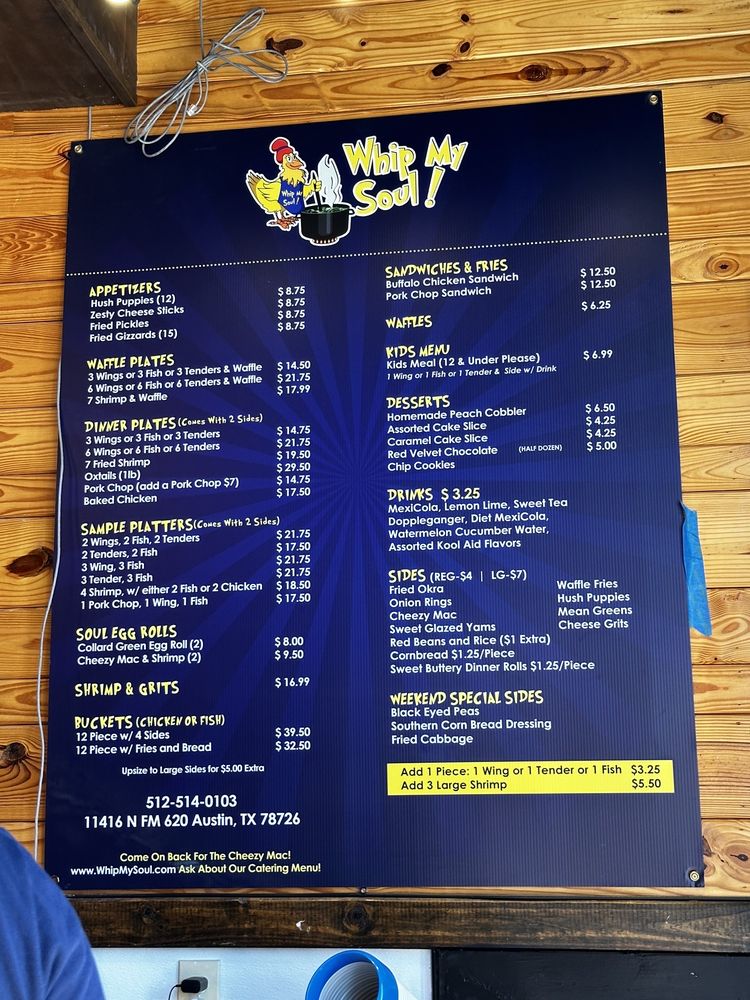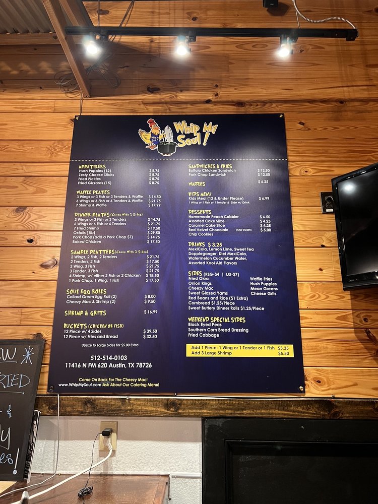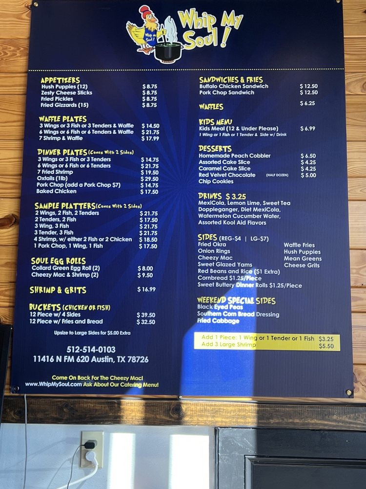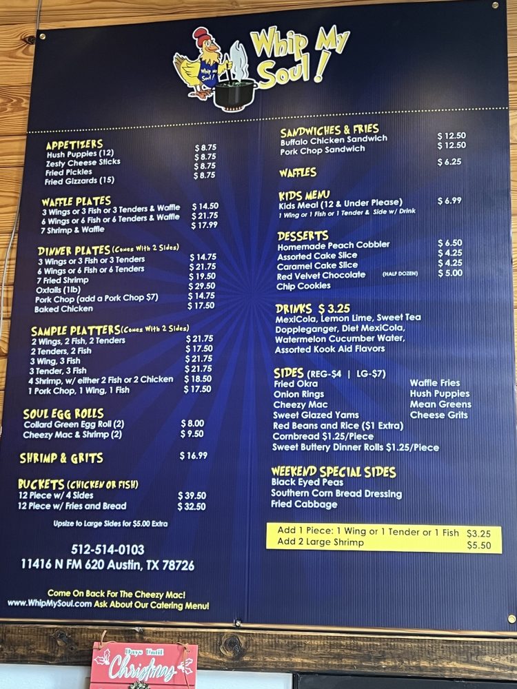 Introducing Whip My Soul, a soulful Southern chicken shop located in Austin, Texas. This divey yet inviting establishment offers a range of delicious dishes perfect for lunch, dinner, or dessert. From large, perfectly seasoned chicken wings to flavorful mac and cheese and glazed yams, each dish is a soulful delight. The collard green egg rolls and oxtail platters are unique and delightful surprises. The cornbread is light and tasty, and the sweet tea and grape koolaid are nostalgic favorites. The ambiance is chill, with friendly staff and a welcoming atmosphere. With a diverse menu, attentive service, and authentic flavors, Whip My Soul is a must-visit for lovers of soul food.